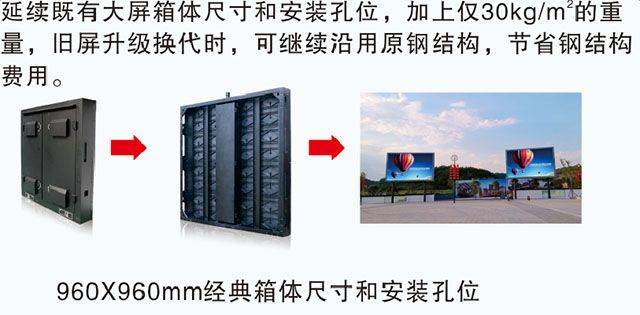 保持960*960的箱体尺寸,经典的安装孔位,省旧屏升级新屏的钢结构再投资。