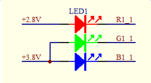 红、绿、蓝灯正常工作时,其压降是不同的,通常分别为1.8V,3.3V,3.3V,加上电路其它元器件的压降,对应于红、绿、蓝灯所需供电电压为2.8V,3.8V,3.8V;