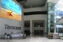 成都腾讯大厦A楼大厅背景墙上。并采用的是当下最为流行的四台松下激光工程投影机PT-FRZ98C。