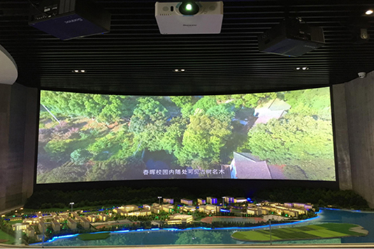 沙盘弧幕融合显示系统:运用索诺克Sonnoc SNP-DSX700 投影机融合正投。东方中原将跨界思维运用到多媒体沙盘设计制作当中,融合灯光、沙盘技术、投影技术等于一体,在保留沙盘直观、震撼的基础效果上,赋予沙盘更强表现力,让观看者体验到声、光、影所带来的极致视听震撼力,让观看多媒体沙盘展示成为一种享受。