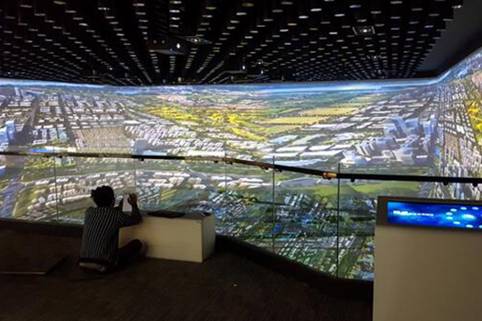 为展现西咸新区以古创今、至美和谐的智慧城市规划, 四楼区域的“沙盘+沉浸式投影”共使用28台视美乐激光高亮工程(SML-PU701),对正面、左右面及沙盘部分三层投影,立面以三折页的形式:左右各14*4米,中间为13*4米;地面沙盘尺寸:13 *4米,投影总面积达160平米。