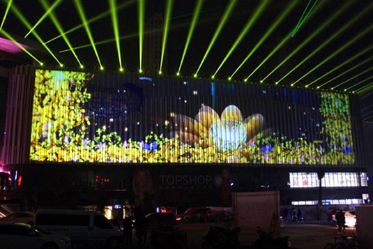 此项目要求极高,遵义奥特莱斯巨幅墙面投影采用大型工程投影系统,投影机需要在总长70米,高度18米的楼体表面上显示投影画面。经过技术人员专业并精确计算,最终决定采用9台20000流明松下三片DLP工程投影机PT-SDZ18K2C进行投射。